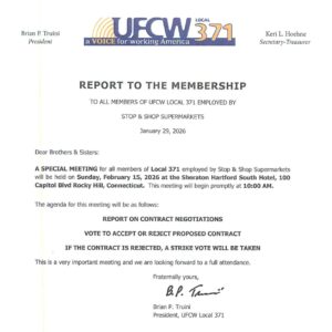 A Contract meeting will be held on Sunday, February 15, 2026 at 10:00 AM for all Local 371 Members employed at Stop & Shop.